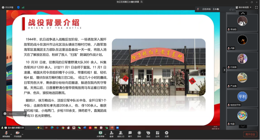 活动开始,分享人详细介绍了徐万粮战役的经过。1944年11月1日,抗日战争进入战略反攻阶段,八路军渤海军区直属团主力部队在滨州市沾化区泊头镇徐万粮村与日军独立步兵第43大队展开了一场诱敌深入的围歼战。我军利用徐万粮村的有利地形,成功诱敌进村,并在一天一夜的激战中重创敌军,击毙日军四十余人、伪军二百余人,粉碎了敌人“扫荡”解放区的阴谋。