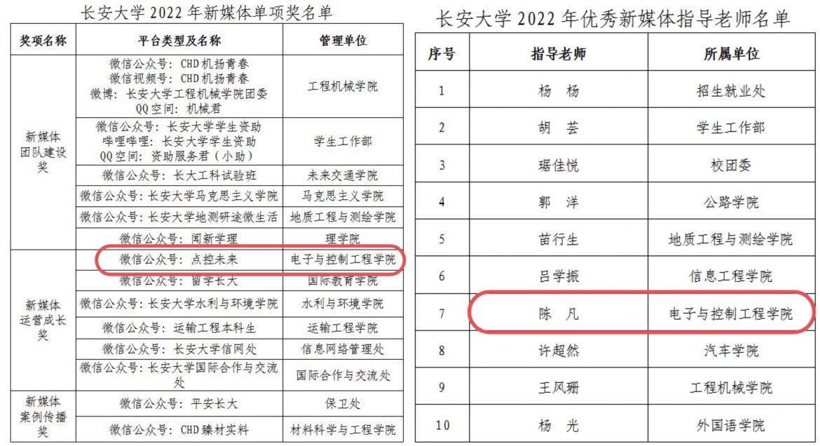 近日,学校党委发布《关于表彰长安大学2022年优秀校园新媒体平台及优秀新媒体指导老师的决定》(长大党宣〔2023〕9号),ms88明升“点控未来”微信公众号荣获“新媒体运营成长奖”,辅导员陈凡荣获“优秀新媒体指导老师”