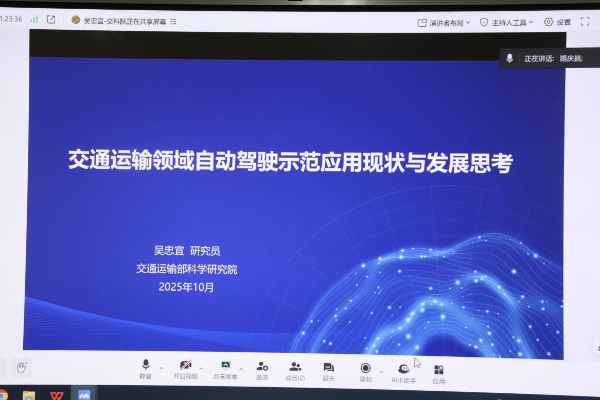 为交流交通运输领域前沿进展,搭建学术交流平台,拓展师生学术视野,10月16日下午,ms88明升于WM3404教室举办“交通运输领域自动驾驶示范应用现状与发展思考”学术讲座——“电控讲坛”第5期。本次线上讲座由学院副院长路庆昌主持,特邀交通运输部科学研究院研究员吴忠宜作为主讲嘉宾。