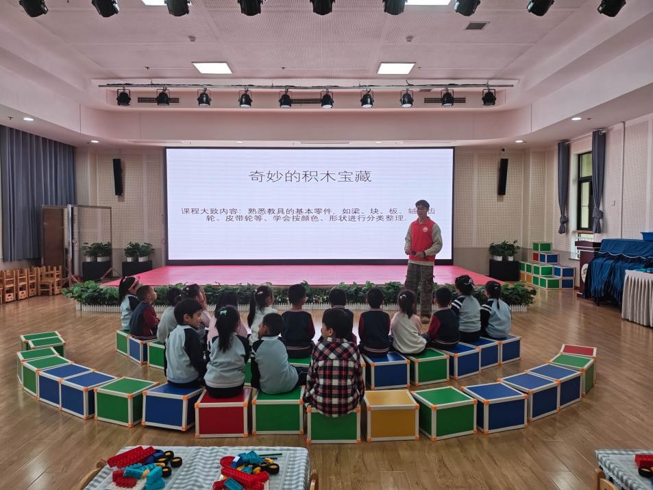 在“认识零件”环节,志愿者通过介绍零件图片并结合实物模型,带领小朋友直观认识积木小车的各类零件,清晰讲解零件名称及其功能,充分激发孩子们的拼装兴趣。